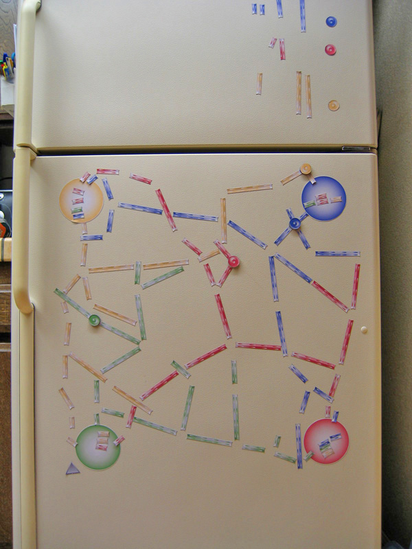 Fridge is a game that takes place on a refrigerator. You do not need to be present when another player takes his or her turn. If you walk by the refrigerator and the triangular turn marker is next to your base then you can make a move. Because of the casual turn structure a game will take about a week or two.