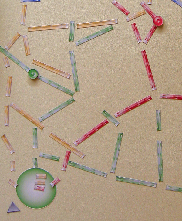 Place the four large circular bases in a square pattern on the refrigerator door. Place all the bars on the freezer door. Randomly determine who will go first. Your first move must be to place a 1-inch bar so that one end touches your base.