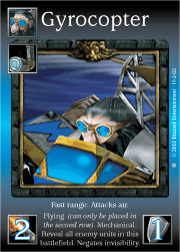 Fast range: Attacks air. Flying (can only be placed in the second row). Mechanical. Reveal all enemy units in this battlefield. Negates invisibility. |