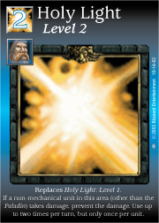 If a non-mechanical unit in this area (other than the Paladin) takes damage, prevent the damage. Use up to three times per turn, but only once per unit. |